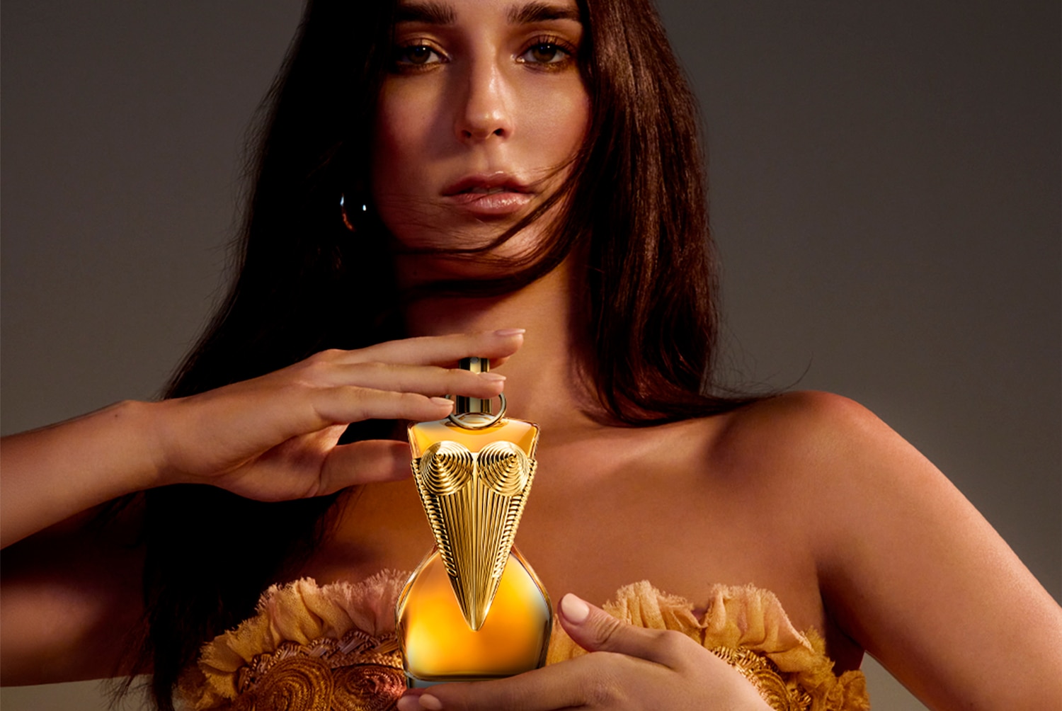 Das neue, intensive Eau de Parfum von Jean Paul Gaultier, Gaultier Divine, präsentiert sich in einem goldenen Flakon in Form eines Frauenkörpers, umgeben von einem goldenen Hintergrund und einer Frau, die goldene Accessoires trägt.