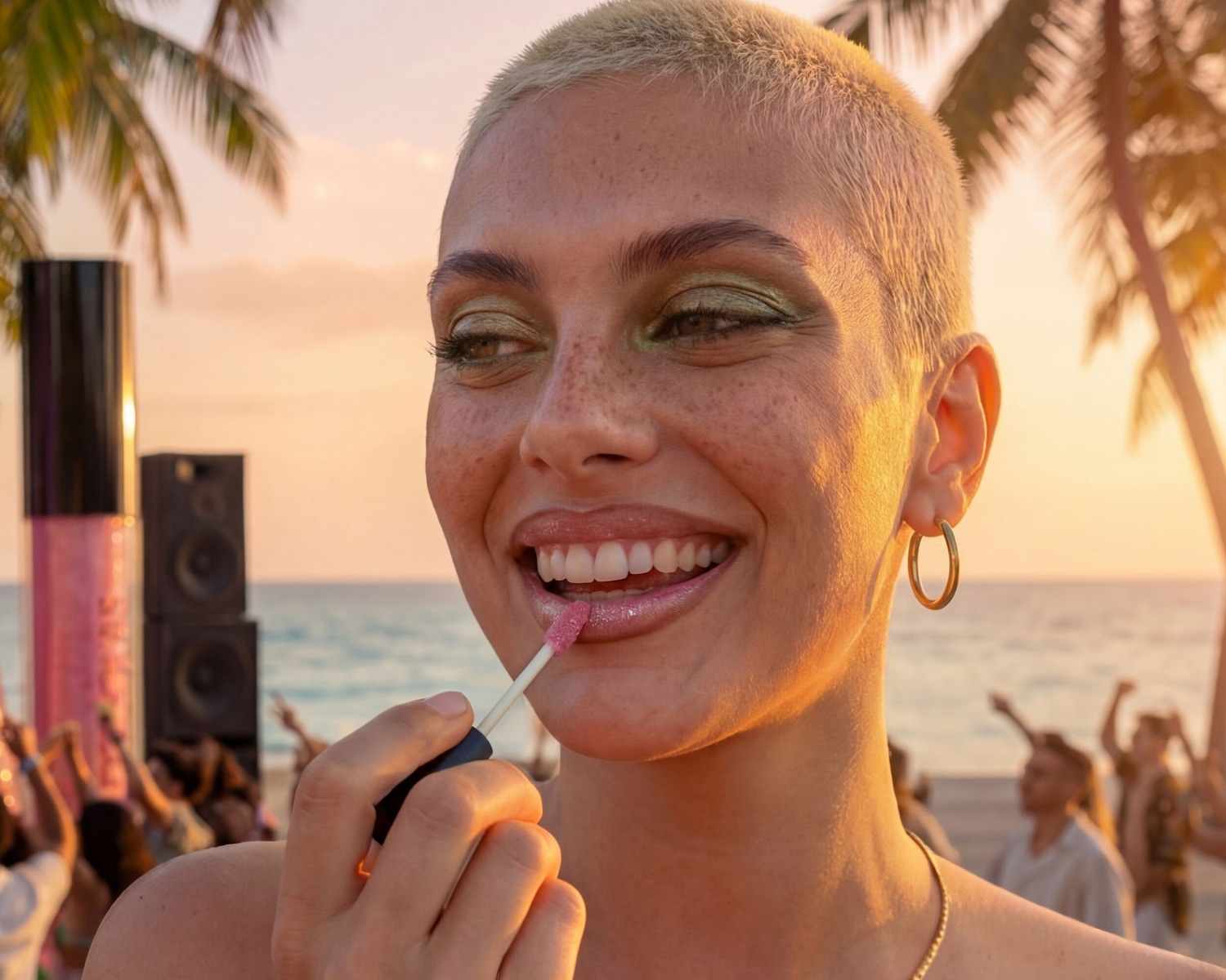Spür den Vibe und greif zu einem grün-gold schimmernden Lidschatten! Warm und natürlich bleibt dein Make-up mit Lipgloss in einem warmen Naturton.