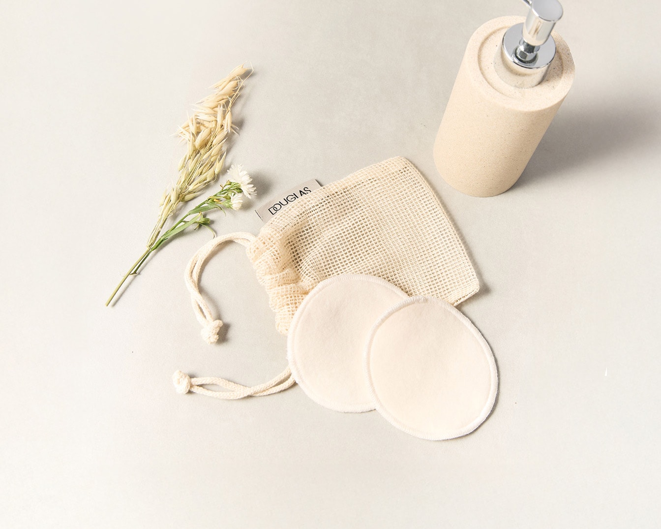 Wiederverwendbare Abschminkpads im Douglas-gebrandeten Beutel aus 100 % Baumwolle (Abschminkpads und Beutel).